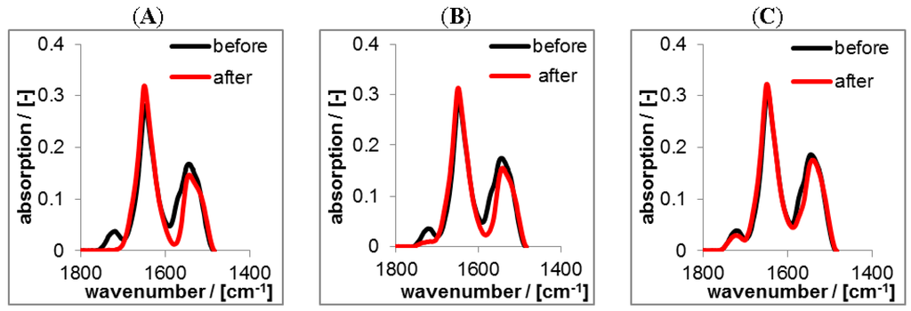 Again, the black spectra represent the RIF/PEC films in the initial dry state at pH = 2. The red spectra in Figure 12 represent PEC films in the dry state after rinsing at pH = 4, pH = 7 and pH = 10. For the release at pH = 4 the spectra before and after rinse were nearly identical, only the band at 1725 cm−1 diagnostic for RIF decreased slightly after rinsing. In contrast for pH = 7 and pH = 10 the intensity of this band significantly decreased. This finding can be explained analogously to the RIS/PEC system, but in an opposite sense. Since RIF has zwitterionic properties and CS is a strong polyanion, RIF acquires considerable amount of positive charge, while CS is negatively charged at pH = 4, and thus electrostatic attraction should prevail. Increasing the pH value RIF gets less positively and more negatively charged, while the charge density of CS is invariant. Hence, at pH = 7 electrostatic attraction between RIF and CS decreases and at pH = 10 it is minimum and turns into electrostatic repulsion. In contrast to the FTIR spectra on the RIS/PEC system those of the RIF/PEC system do not show intensity variations of bands diagnostic for PLL or CS. Less loaded drug amounts might be the cause for the RIF/PEC system.