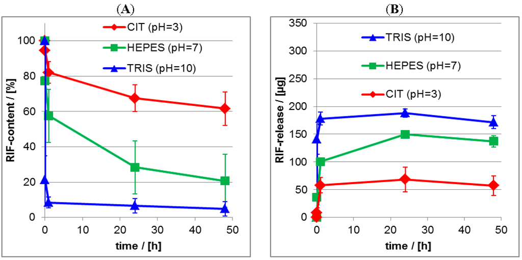 The release studies on RIF from PLL/CS system at pH = 7 did not result in such a good retention compared to RIS. Residual contents of around 20% for RIF were obtained under this pH condition. This different behavior might be explained by the zwitterionic character of RIF allowing to reverse its net charge sign from positive at pH = 4 to negative at pH = 10, while the negative net charge of RIS can be only neutralized by decreasing the pH from 10 to 4, but not reversed. Hence, for the RIS/PEC system electrostatic attraction can be tuned gradually, while for the RIF/PEC system electrostatic attraction can be turned step-like into repulsion, upon varying the pH value, which seems to be responsible for the lower retention of RIF at pH = 7.