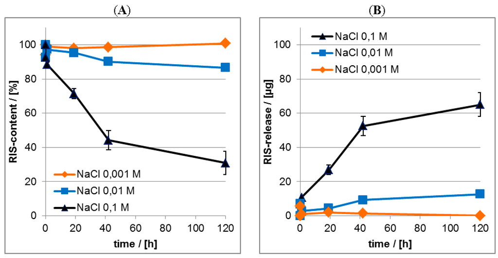 In the Figure 14 results on the release kinetics of RIS from PEC coatings in dependence of NaCl concentration in the release medium determined by both ATR-FTIR (Figure 14A) and UV/VIS spectroscopy (Figure 14B) are shown. Herein we compare the RIS loss of the PEC films (ATR-FTIR) with the RIS enrichment in the release medium (UV/VIS). The UV/VIS data were shown as RIS masses (µg) in the release media.