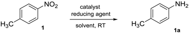 Evaluation of various Ag-containing catalysts, reducing agents and solvents in the catalytic reduction of 4-nitrotoluene (1) into 4-toluidine (1a).