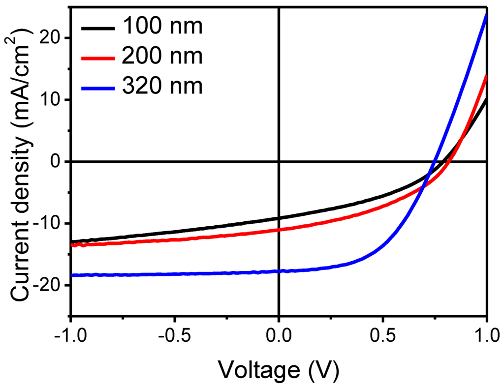 | BHJ Thickness | Voc (V) | Jsc (mA/cm2) | Fill Factor | PCE (%) |