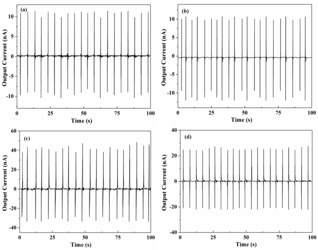 Current generation under a periodic mechanical tapping. (a) Pure PVDF; (b) 10 wt % PMN-PT; (c) 20 wt % PMN-PT; and (d) 25% PMN-PT.