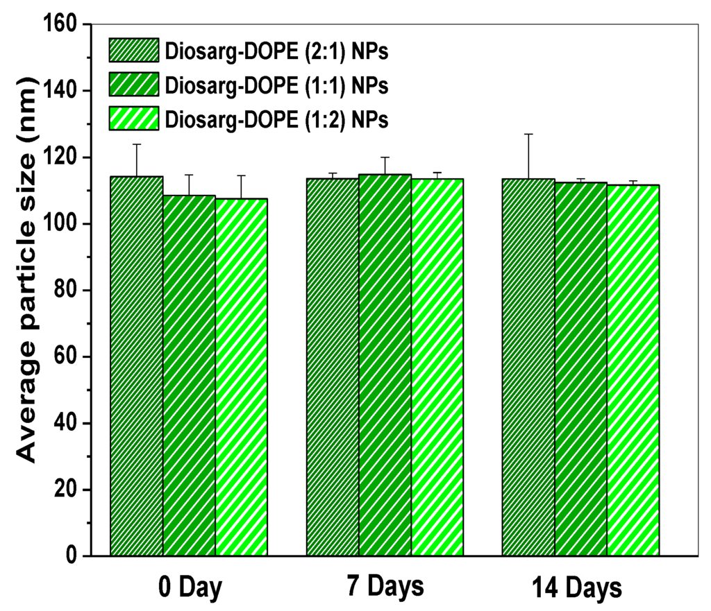 Storage stability of the Diosarg-DOPE (2:1, 1:1, 1:2) NPs in distilled water after 0 day, 7 days and 14 days; the average particle size was measured by the dynamic light scattering instrument.