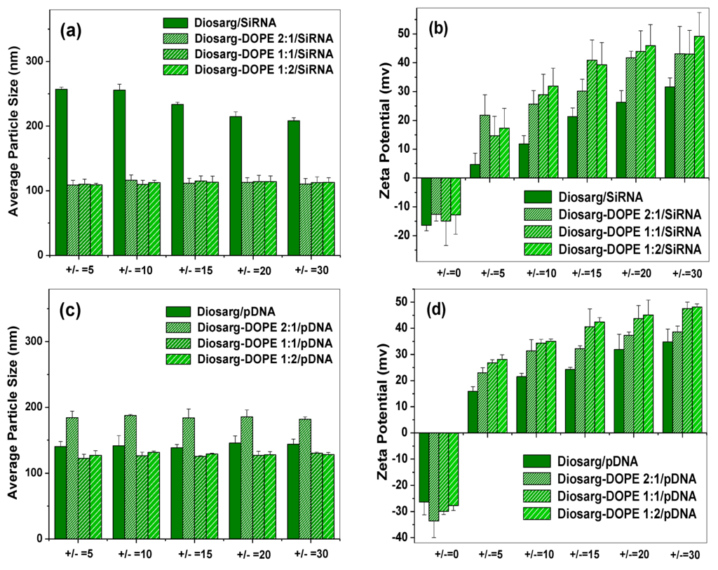 Average particle sizes and zeta potentials of the Diosarg/siRNA and Diosarg-DOPE NPs/siRNA (a,b), as well as the Diosarg/pDNA (c) and Diosarg-DOPE NPs/pDNA (d) complexes under the +/− charge ratios from 0 to 30 determined by DLS.