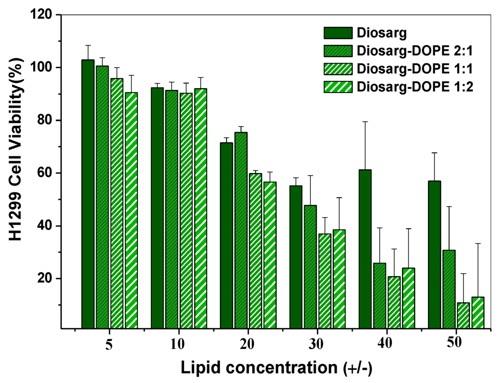 Cytotoxicity of H1299 cells incubated with the Diosarg lipid and Diosarg-DOPE NPs at various +/− charge ratios (pDNA 0.5 μg/well), with the Diosarg lipid at the same +/− charge ratio as the control.