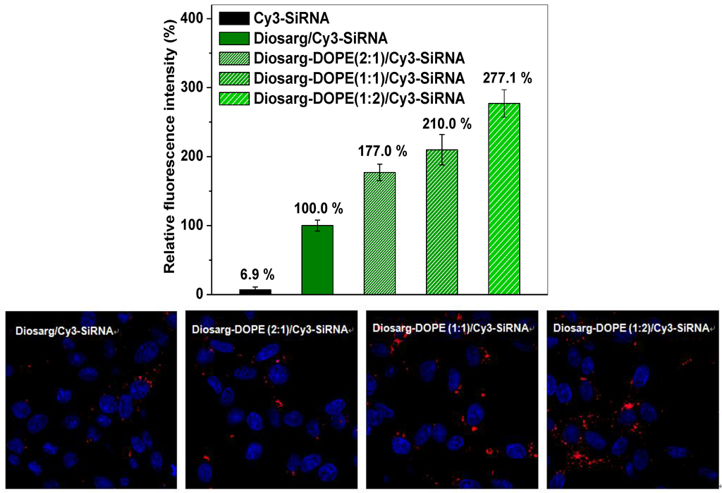 Intracellular uptake of the Diosarg lipid and Diosarg-DOPE (2:1, 1:1, 1:2) NPs/Cy3-siRNA complexes (+/− = 10) in H1299 cells measured by flow cytometry (10,000 cells for each sample) and observed by fluorescence microscopy (blue: DAPI (4’,6-diamidino-2-phenylindole) stained nuclei; red: Cy3-labeled siRNA).