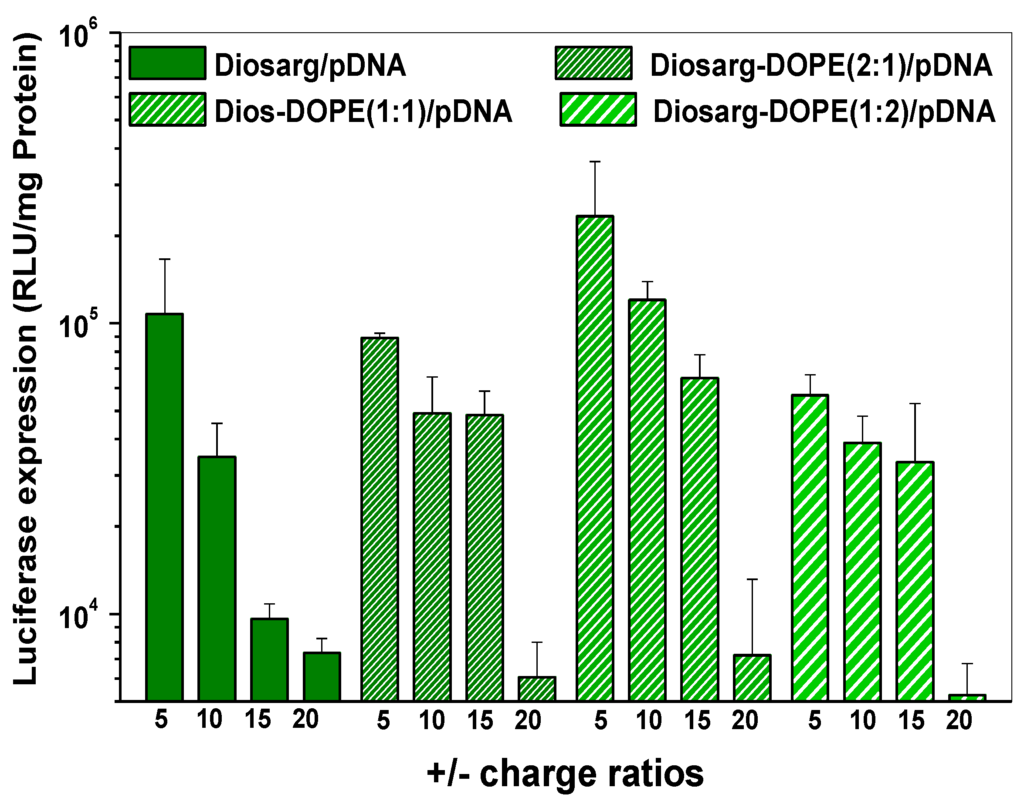Prior works have revealed that the insertion of helper lipids, such as DOPE and DOTAP (1,2-Dioleoyl-3-trimethylammonium-propane chloride), into cationic liposomes could enhance the gene transfection properties, change the related membrane fusion properties, as well as influence the subsequent intracellular gene releasing manners [44,45]. Herein, the luciferase pDNA transfection capabilities of the Diosarg lipid and Diosarg-DOPE (1:1, 1:2, 2:1) NPs were examined by luciferase gene transfection assay. As shown in Figure 7, the Diosarg lipid and Diosarg-DOPE NPs showed different pDNA transfection capacities, Diosarg showed drastic decreasing of the gene transfection efficacy with the increasing of the +/− charge ratios. Diosarg-DOPE (2:1)/pDNA and Diosarg-DOPE (1:2)/pDNA complexes showed comparable slow drop trends in their transfection efficacy within the +/− charge ratio of 5–15, although their transfection efficacy decreased to some extent, due to the template effect of the Diosarg-DOPE NPs. Notably, the Diosarg-DOPE (1:1)/pDNA showed the highest pDNA transfection efficiency among the complexes. Sakurai et al. disclosed similar results in cationic lipid DA-DOPE assembled nanoparticles, in which the composition of DA:DOPE = 1:1 showed the highest gene transfection efficiency [22]. The trend of pDNA transfection efficiency resembled the intracellular transportation efficacy (Figure 6), and the Diosarg-DOPE (1:1)/pDNA complexes have the highest intracellular transportation efficacy, which suggested that the intracellular transportation efficacy and subsequent gene delivery capacity could be controlled/optimized by changing the helper lipid ratios.