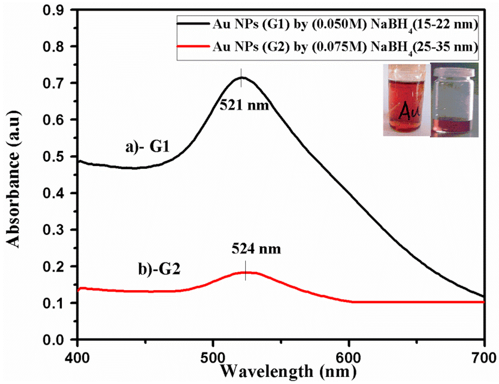 Gold nanoparticles were synthesized by employing sodium borohydride (NaBH4) as a reducing agent instead of old Turkevich or citrate method [20,21,22]. Two samples of gold nanoparticles (G1, G2) were fabricated by reduction of (0.2 mM, 40 mL) HAuCl4·3H2O with (0.050 M and 0.075 M, 0.02 mL) NaBH4. The solution of HAuCl4·3H2O (0.2 mM, 40 mL) was poured in a beaker and chilled solution of NaBH4 was added in it. Immediately the yellow color of gold salt solution converted into brick red color. Samples G1 and G2 were used as prepared. The chemical equation for the reaction is: