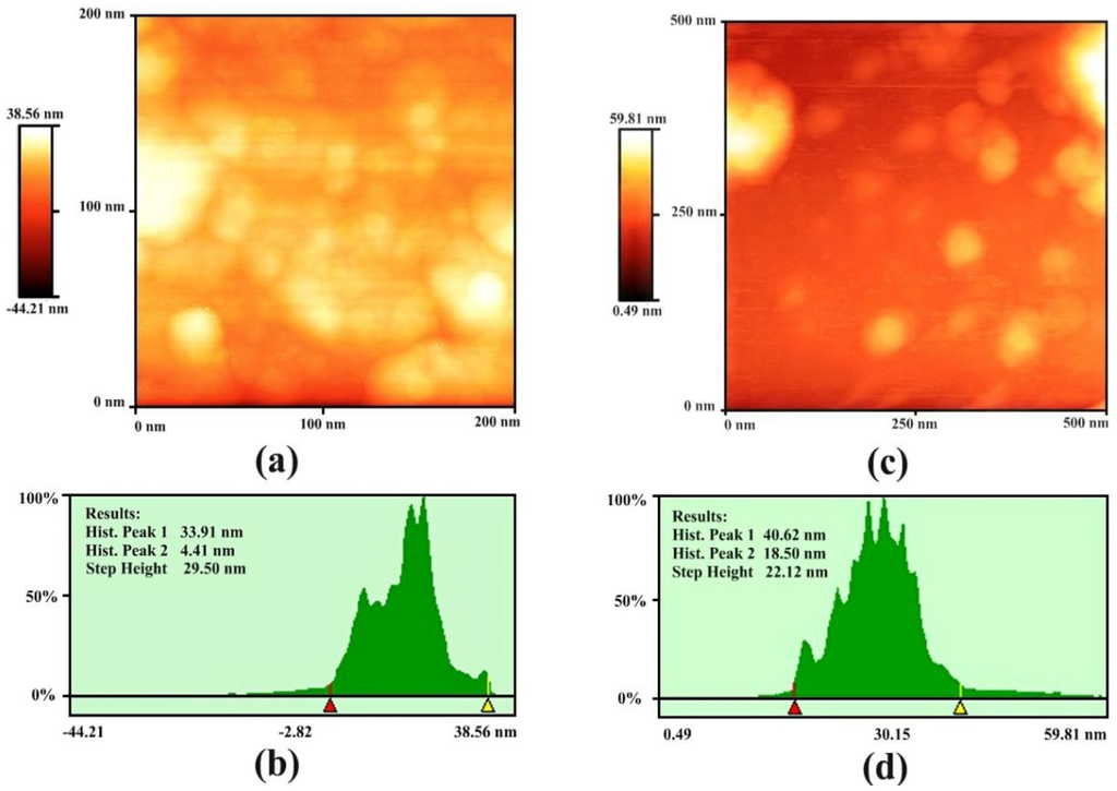 Atomic force microscopy (AFM) analysis of gold nanoparticles: (a,b) 2D image and histogram analysis of sample G1, respectively; (c,d) 2D image and histogram analysis of sample G2, respectively.