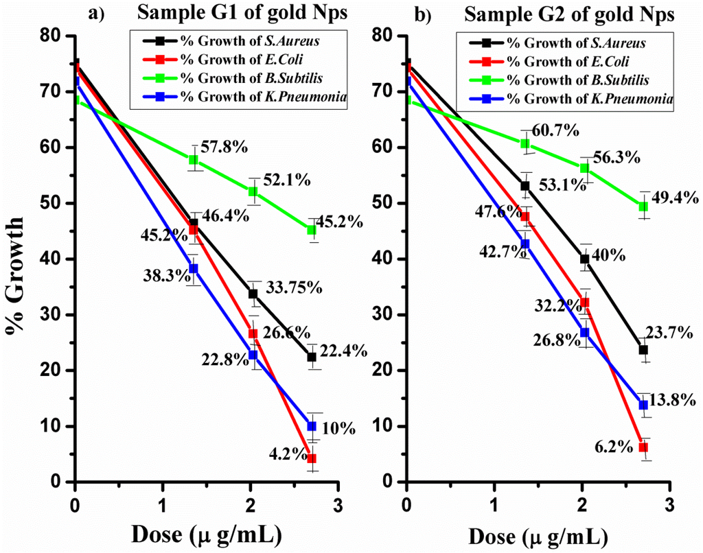 G1 gold NPs which had a smaller size (6–34 nm) than G2 NPs revealed the following reduction in growth. The maximum growth of S. aureus without any dose was 75.19%, which was reduced up to 22.4%, whereas E. coli with a maximum growth of 74.3% was reduced up to 6.2%. Thus, for complete inhibition of S. aureus, a larger dose is required. The reduction in growth of B. subtilis was only 45.2% and that of K. pneuomonia was reduced up to 10%. On the other hand, the reduction in growth by G2 with gold NPs with a size of 20–40 nm on S. aureus was up to 23.7% whereas E. coli was reduced up to 6.2%. The reduction in growth of B. subtilis was 49.4% and the growth of K. pneuomonia was reduced up to 13.8%, as exhibited in Figure 4.