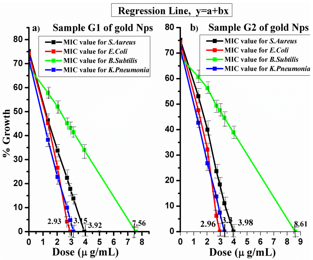 From Figure 5, the minimum inhibitory concentrations (MICs) of sample G1 with sizes of 7–34 nm are 2.93 μg/mL, 7.56 μg/mL, 3.92 μg/mL, and 3.15 μg/mL for E. coli, B. subtilis, S. aureus, and K. pneumonia, respectively. The MICs of sample G2 with sizes of 20–40 nm are of 2.96 μg/mL, 8.61 μg/mL, 3.98 μg/mL and 3.3 μg/mL for E. coli, B. subtilis, S. aureus, and K. pneumonia, respectively.