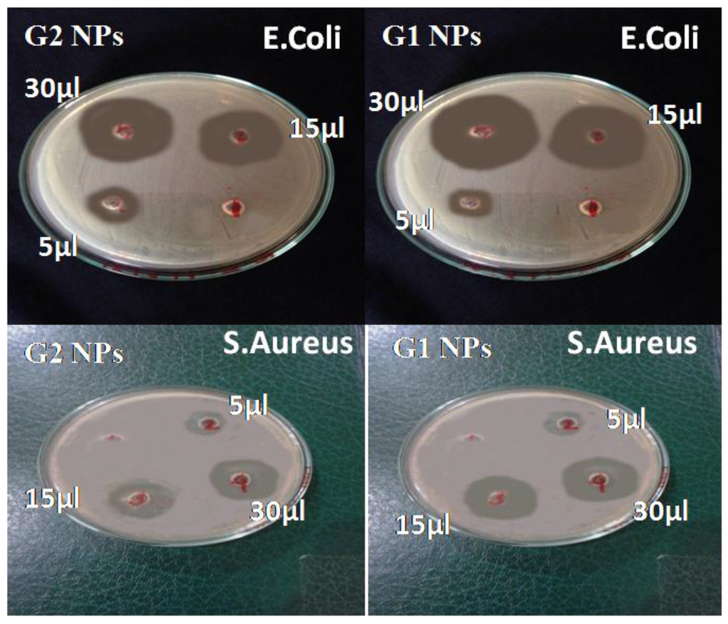 The well diffusion technique results of G1 NPs and G2 NPs against two bacteria, E. coli and S. aureus, are represented in Figure 6 and expressed in Table 2, which clearly demonstrate the inhibition zones for gold NPs that are missing in the control reading. Furthermore, the inhibition zone of G1 NPs is slightly larger than that of G2 NPs, as indicated in Table 2.