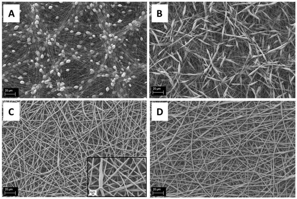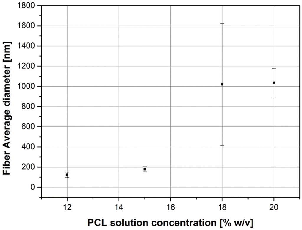 All measured values of fiber diameters are two or three times lower with respect to similar samples reported in literature [5,25]. In fact, Ferreira and et al. [5] reported an average fiber diameter of 1.96 ± 0.52 μm for mats obtained from a solution of 20 wt % of PCL in acetic acid, with a flow rate of 0.4 mL/h and an applied voltage of 6 kV and Kanani et al. [25], starting from a solution of 20% PCL in glacial acetic acid, reported a range of average fiber diameters between 2.5 and 3 μm, with an applied voltage of 15 kV and a flow rate of 0.5 mL/h. The shape and the size of the beads in samples obtained from a solution of PCL 12% w/v are comparable to the beads size reported by Kanani et al. [25] for a solution of 10% PCL, even if the fiber average diameter is slightly different.