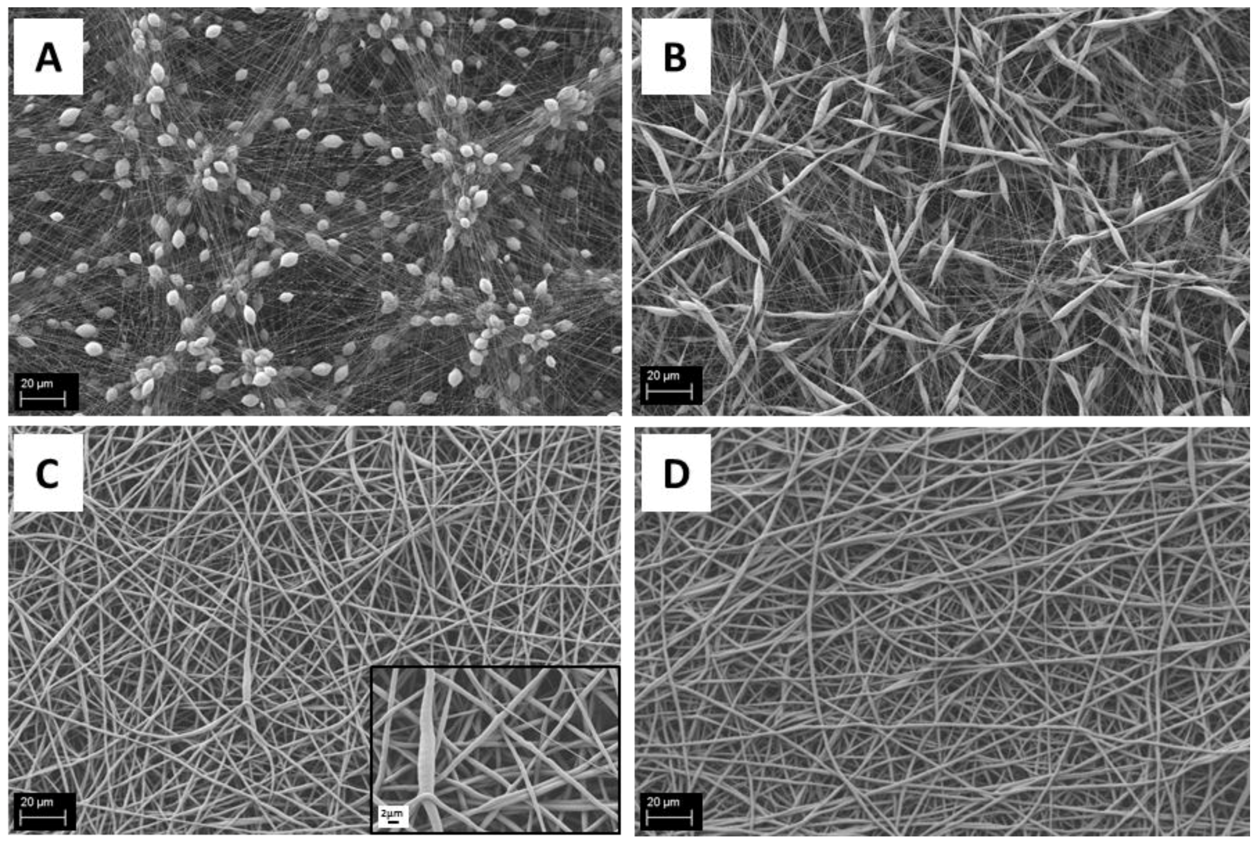 Scanning electron microscopy (SEM) micrographs of electrospun poly(epsilon-caprolactone) (PCL) mats obtained from different PCL solutions in acetic acid (scale bar 20 μm): (A) 12% w/v; (B) 15% w/v; (C) 18% w/v; and (D) 20% w/v.