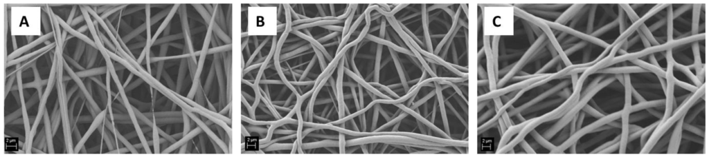 Starting from the solution of 20% w/v of PCL in acetic acid, an evaluation of the influence of the electrospinning process parameters has been performed. The parameter found to be the most relevant was the applied voltage: keeping constant all the other process parameters, applied voltages of 10, 15 and 20 kV were applied and the obtained mats are reported in Figure 3. It is possible to notice that beads-free electrospun mats have been obtained for all conditions. For the lowest value of the applied voltage, the fiber diameter is not homogeneous and it is possible to see discontinuities inside the mats (Figure 3A). On the other hand, the fibers obtained using the highest value of applied voltage started to blend and the yield of the electrospinning process itself was reduced in comparison to the other two samples.