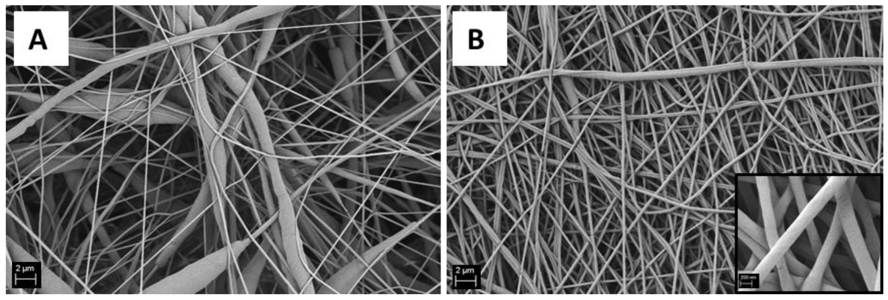 The use of formic acid for electrospinning PCL has been already associated in the literature to a reduction in average fiber diameter of the obtained mats [24]. In the present work the addition of formic acid to the PCL solution was performed in order to produce homogeneous nanofibrous mats, since with the use of acetic acid alone it was not possible to achieve an homogeneous distribution of fiber diameters in the nanoscale, as shown in Figure 4. Compared to the literature [24], by comparing a similar polymer concentration of the starting solution with greater amounts of acetic acid and with different electrospinning parameters, in the present work, fibers exhibiting two times lower average fiber diameters were obtained. In fact, PCL nanofiber mats were obtained by keeping constant the value of the PCL concentration at 15% w/v with the addition of formic acid (in ratio 1:1 to acetic acid) and optimizing the electrospinning parameters. The average fibers diameter was 0.20 ± 0.04 μm, while the similar sample without formic acid exhibited an average fiber diameter of 0.3 ± 0.2 μm. SEM micrographs of both samples are shown in Figure 4.