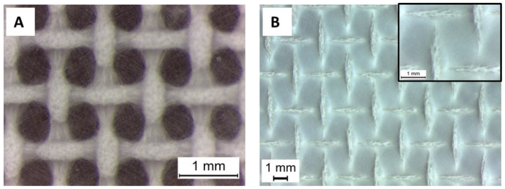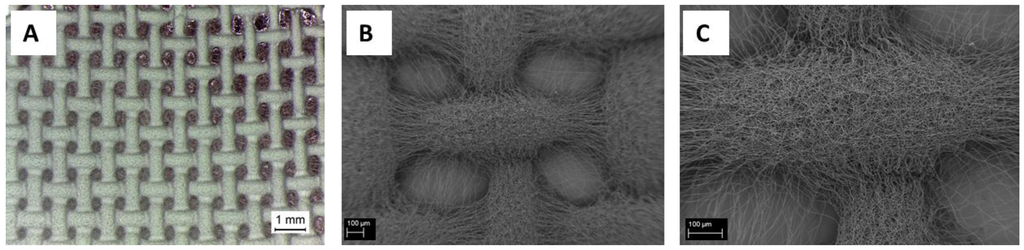 For the nanofibers (sample PCL15_AAFA), the same patterned collector used for microfibers was employed, but it was noticed that a reduced time of electrospinning was necessary for formation of the patterned mesh, shown in Figure 6A. This reduced time implies also a reduced thickness of the mats, posing issues in the mats handling. In addition, another patterned collector with a wider net was used with the nanofibers in order to obtain better results in terms of mats thickness. However, with the wider nets, it was not possible to achieve open macropores and the electrospun mats covered completely the patterned target, maintaining the morphology of the pattern, as shown in Figure 6B.