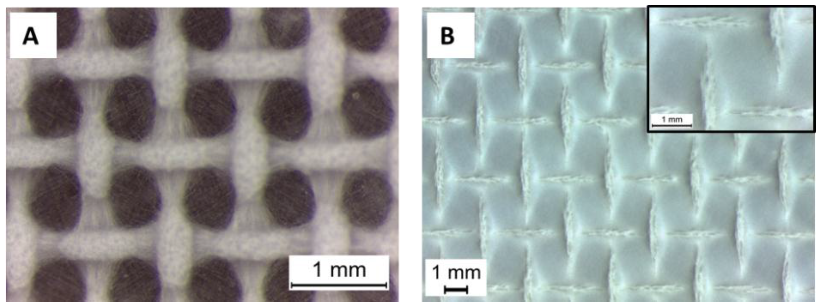 PCL microfibers, obtained with the PCL solution of 20% w/v in acetic acid (sample PCL20_AA_15), were obtained using the same electrospinning parameters, and applying a patterned target, as shown in Figure 5. The fibers morphology was not affected by the different targets used and, even if few fibers are visible inside the pores, well-defined macropores of square shape and average size of 0.47 ± 0.08 mm were obtained.
