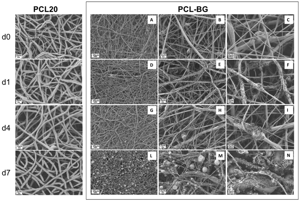SEM micrographs of PCL and PCL-bioactive glass (BG) composite electrospun mats before immersion in simulated body fluid (SBF) solution (PCL d0 and PCL-BG d0 (A–C)) in the first row; after one day of immersion in SBF (PCL d1 and PCL-BG d1 (D–F)) in the second row; after four days of immersion in SBF (PCL d4 and PCL-BG d4 (G–I)); and after seven days of immersion in SBF (PCL d7 and PCL-BG d7 (L–N)).