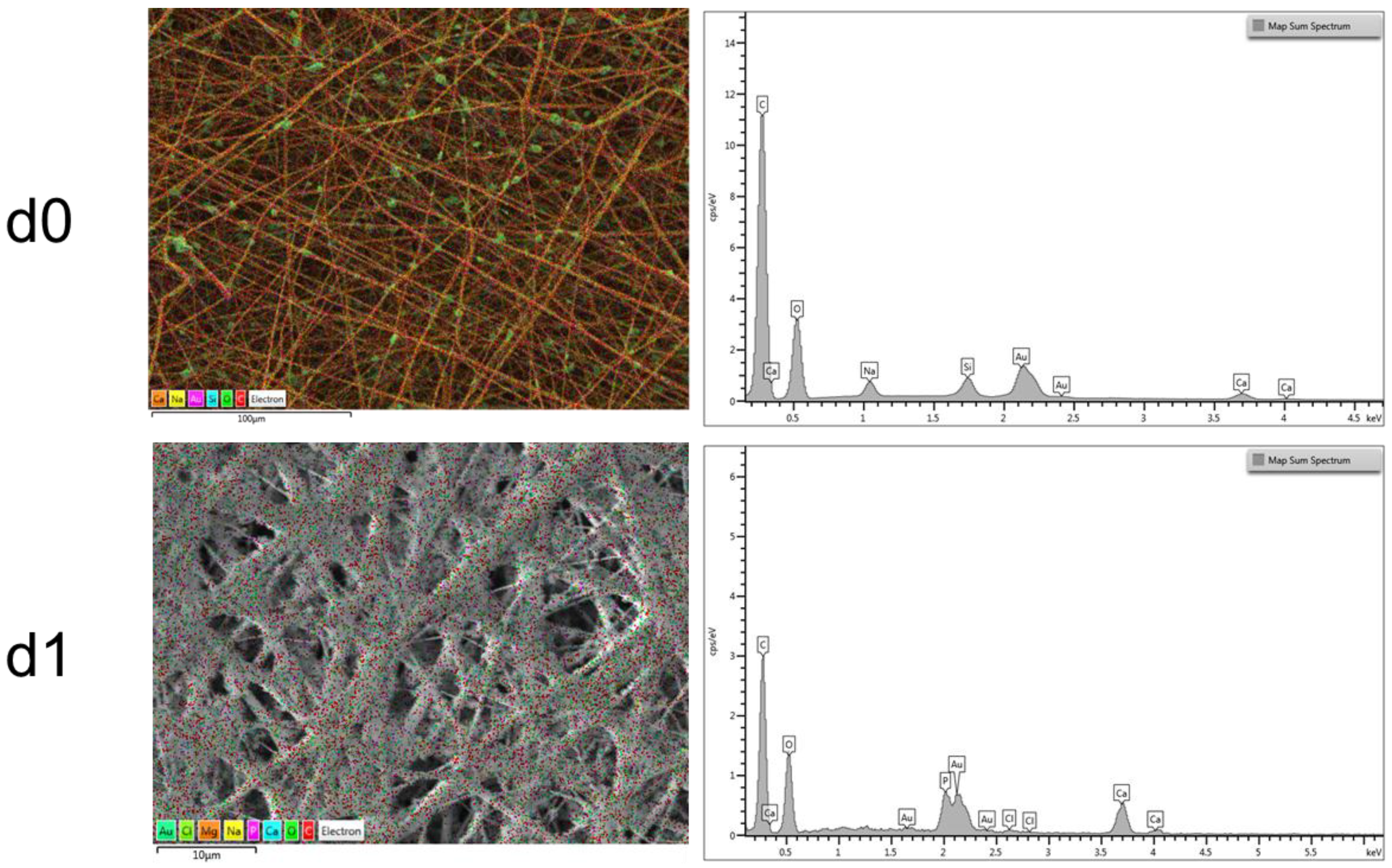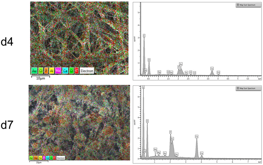 Energy dispersive X-ray (EDX) analysis of PCL-BG composite electrospun mats before immersion in SBF solution (PCL-BG d0) in the first row; after one day of immersion in SBF (PCL-BG d1) in the second row; after four days of immersion in SBF (PCL-BG d4); and after seven days of immersion in SBF (PCL-BG d7).