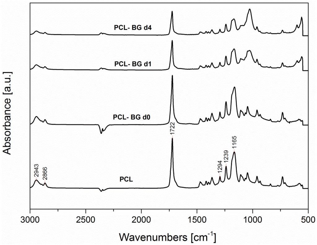 Fourier transform infrared spectroscopy (FTIR) spectra in the range 3000–500 cm−1 for electrospun samples of neat PCL (PCL), PCL with BG particles before immersion in SBF solution (PCL-BG d0) and after one day (PCL-BG d1) and four days (PCL-BG d4) of immersion in SBF solution (the characteristic peaks are discussed in the text).