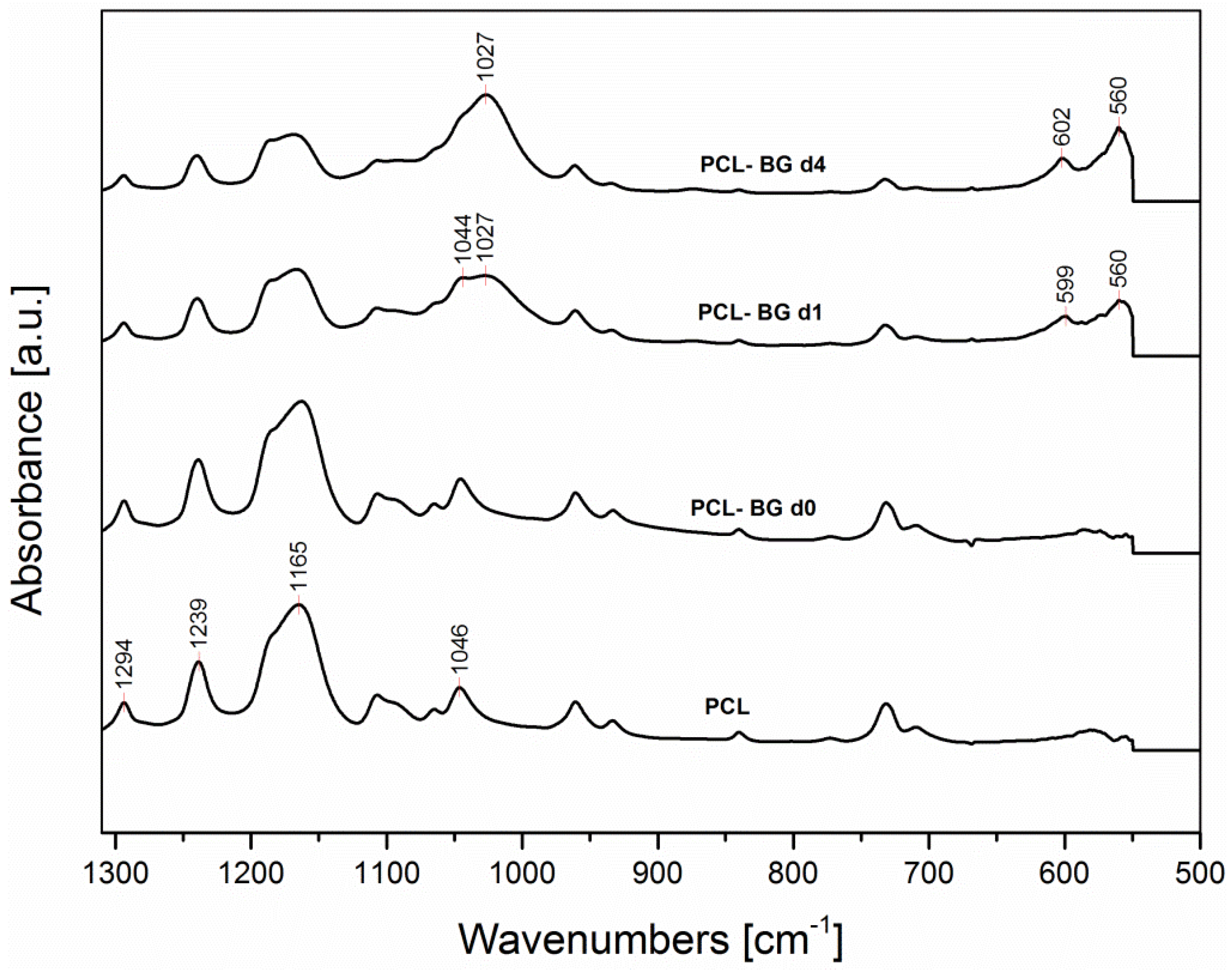 The sample bioactivity (given by the ability of the material to induce the formation of hydroxyapatite on its surface [41]) has been tested by immersion in SBF solution. Already after one day of immersion (PCL-BG d1, spectrum reported in Figure 10) it is possible to notice a reduction in the intensity of the peaks centered around 1165 and 1045 cm−1. Moreover, new peaks are observed centered around 1027 cm−1, ascribable to PO43− asymmetric stretching vibration, according to [42]. In addition, the new peaks at 560 and 600 cm−1, are due to P–O bending vibration in crystalline phosphate, like apatite [43].