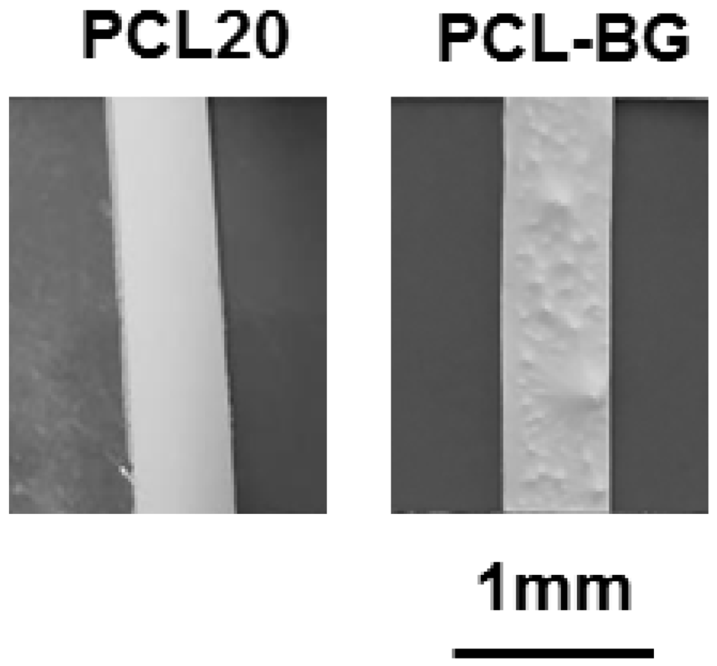 The addition of BG particles to the PCL solution before electrospinning was investigated to evaluate the suitability of the benign solvents for electrospinning, as well as to demonstrate the versatility of the approach for the fabrication of composite fibrous mats.