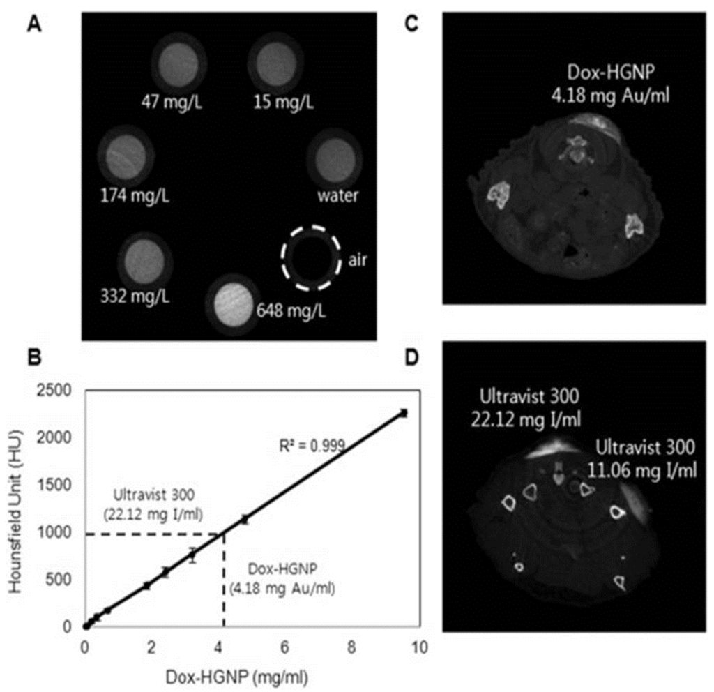 In vitro and in vivo micro-CT images: (A) concentration-dependent CT images of air, distilled water, and doxorubicin-loaded hollow gold nanoparticles (Dox-HGNPs); (B) X-ray absorption of Dox-HGNP and Ultravist 300; (C) cross-sectional CT image in the back skin of mice after injection of Dox-HGNPs; and (D) Ultravist 300. Reproduced with permission from [51]. Copyright Journal of Controlled Release, Elsevier, 2015.