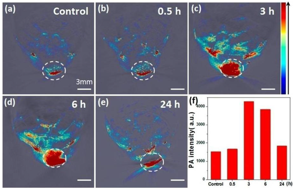In vivo multispectral optoacoustic tomography (MSOT) imaging. (a–e) MSOT images of tumor before and after intravenous injection with Bi2S3 nanorods (NRs); and (f) photoacoustic signal intensity in tumor at different time points. Reproduced with permission from [105]. Copyright American Chemical Society, 2015.