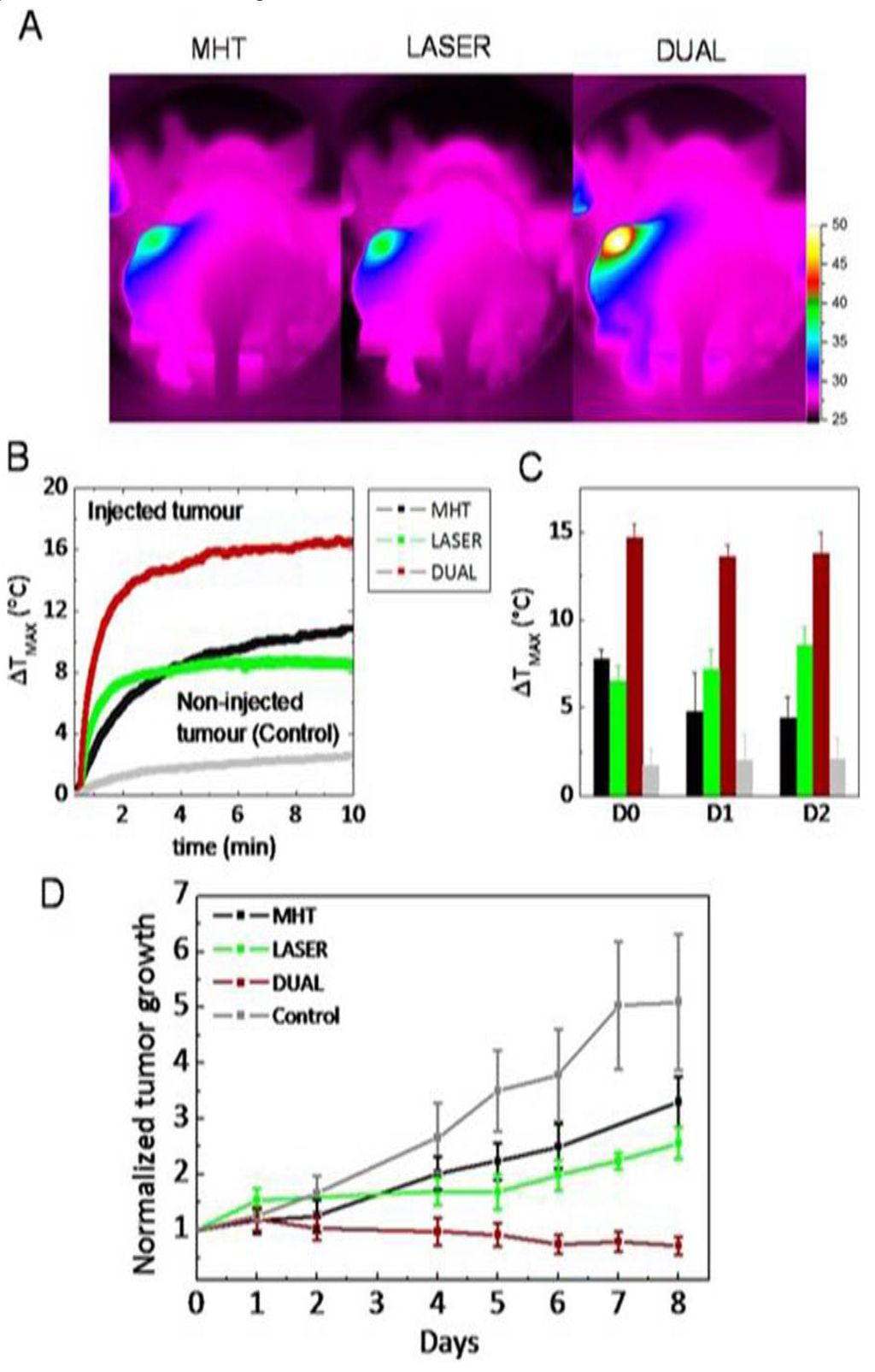 (A) Thermal images acquired after the intratumoral injection of nanocubes and the application of magnetic hyperthermia (MHT), near-infrared (NIR)-laser irradiation, or dual-mode treatment (both effects); (B) thermal elevation curves for the non-injected tumor in the dual condition; (C) average final temperature increase obtained on day 0 (1h after injection) and one and two days after injection for non-injected tumors; and (D) average tumor growth in nanocube-injected mice. Reproduced with permission from [143]. Copyright American Chemical Society, 2015.