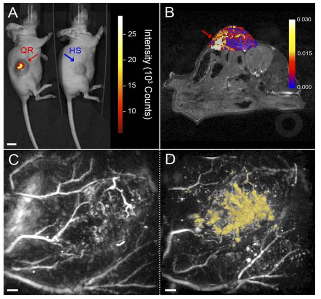 Multimodal in vivo imaging of quantum rattles (QRs): (A) NIR fluorescent intensity in the areas where QRs (red) and non-fluorescent hollow mesoporous silica shells (HS) control (blue); (B) MR image obtained following the injection of QRs; and 3D photoacoustic images of tumors acquired at 670 nm before (C) and after (D) the injection of QRs. Reproduced with permission from [191]. Copyright Proceedings of the National Academy of Sciences of the United States of America, 2015.