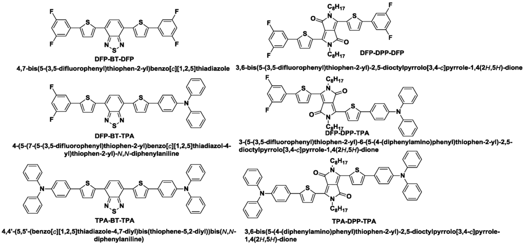 Chemical structures of small molecules (DFP-BT-DFP, DFP-BT-TPA, TPA-BT-TPA, DFP-DPP-DFP, DFP-DPP-TPA, and TPA-DPP-TPA). DFP: fluorinated phenyl; BT: 2,1,3-benzothiadiazole; DPP: diketopyrrolopyrrole; TPA: triphenyl amine.