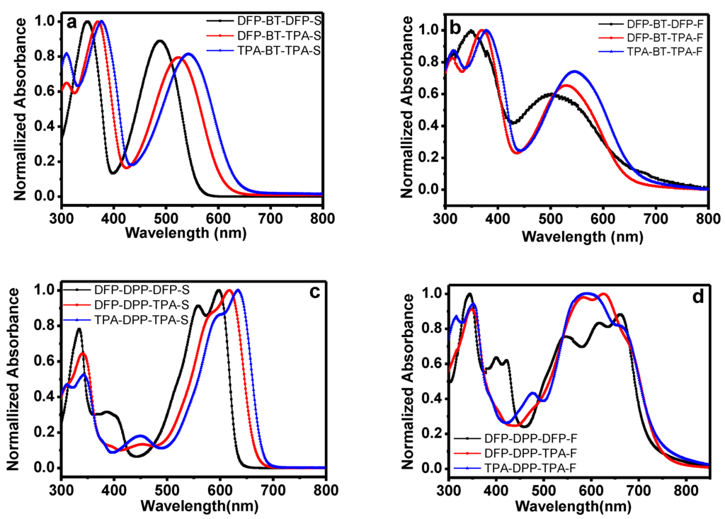 The normalized ultraviolet-visible spectroscopy (UV-VIS) absorption spectra of six small molecules in dilute CB solution and as thin films at 25 °C are shown in Figure 1. These small molecules exhibit a broad absorption in the range from 300 to 700 nm with two distinguishable absorption bands, which could be attributed to the π-π* transition and the internal charge transfer (ICT) interaction between the donor and the acceptor units [4,21,28]. Upon going from solution to the solid state, the absorption spectra become broader and redshift 17 nm for DFP-BT-DFP, 5 nm for DFP-BT-TPA, and 5 nm for TPA-BT-TPA, respectively, which can be attributed to the closer π-π stacking in solid state. The onsets of film absorption spectra are 636, 643, and 659 nm, respectively, for these small molecules, and optical band gaps (Eg, opt) were calculated to be 1.95, 1.93, and 1.88 eV, respectively. Similar to BT based small molecules, DFP-DPP-DFP, DFP-DPP-TPA, TPA-DPP-TPA show broader absorption over the range from 300 to 750 nm with two distinguishable absorption bands. Specifically, the absorption for DFP-DPP-DFP showed stronger shoulder peaks, revealing more ordered molecular stacking capabilities in the solid state [37,38]. From the absorption onsets, the optical band gaps were estimated to be 1.73, 1.66, and 1.63 eV for DFP-DPP-DFP, DFP-DPP-TPA, and TAP-DPP-TPA, respectively.