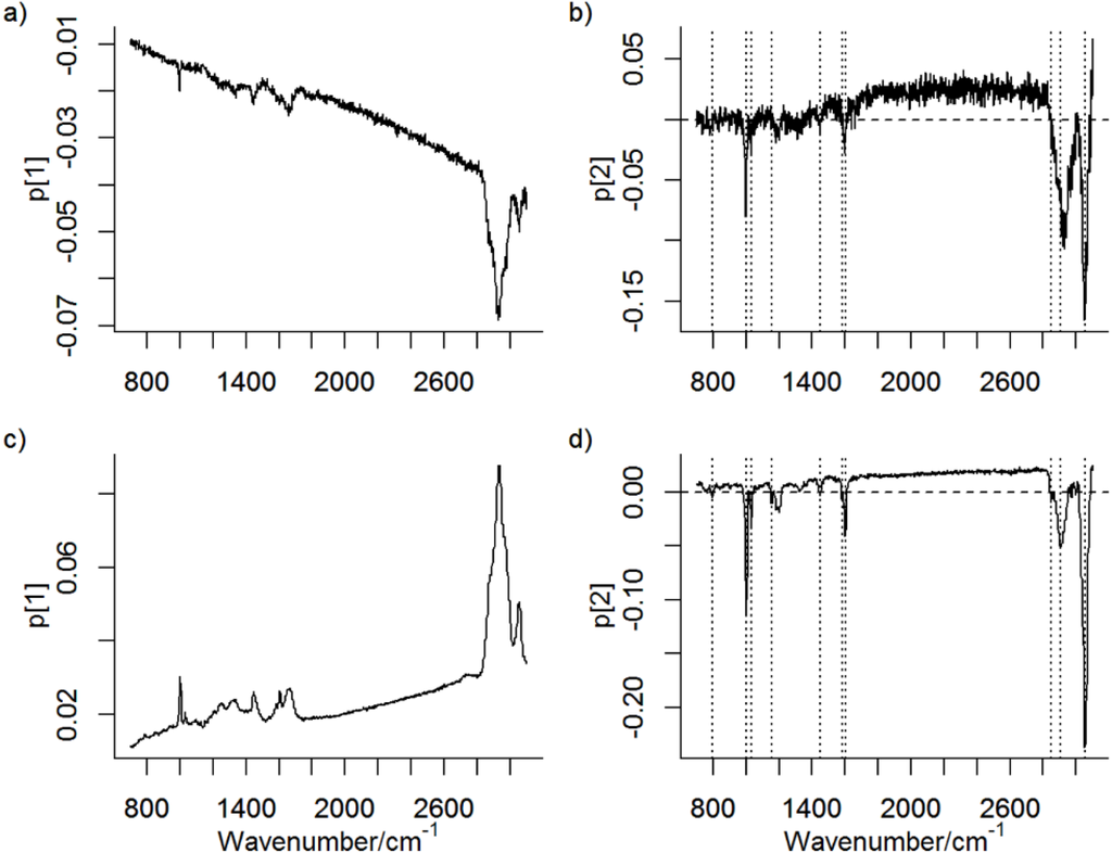 PCA on mean centered data in the 700 cm−1 to 3100 cm−1 spectral region was used to reduce the number of variables (1600 wavenumbers) to 2 PC:s that summarize the largest variance in data.
