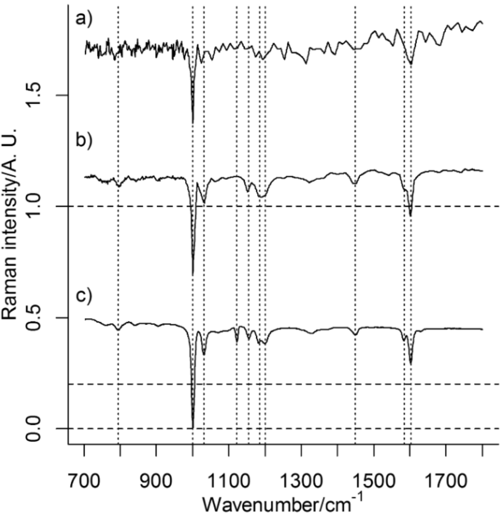 Loadings for PC2 for (a) the 500 nm image; and (b) the 100 nm image. (c) Reference spectrum of PS multiplied by −1. Raman bands assigned to PS are marked with dashed lines. An intensity offset have been added to the spectra.