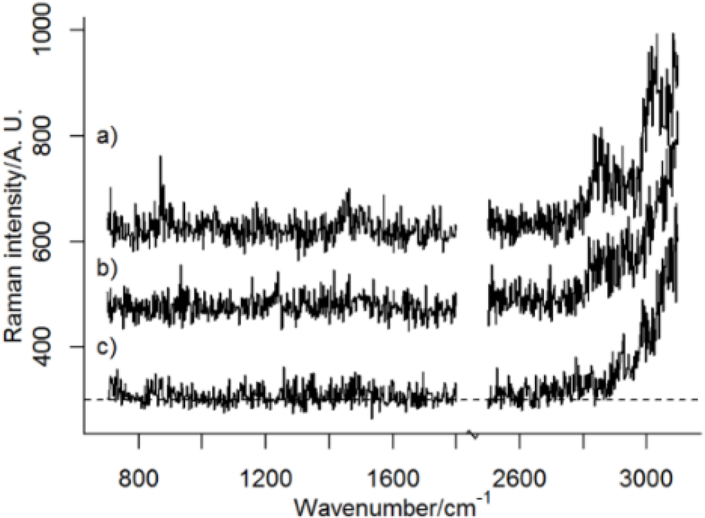 Raw spectra from (a) a pixel centered at the largest particle agglomerate; (b) a pixel from the cell in a region free from particles; and (c) the background (substrate). All pixels are from the 100 nm image. An intensity offset have been added to the spectra.