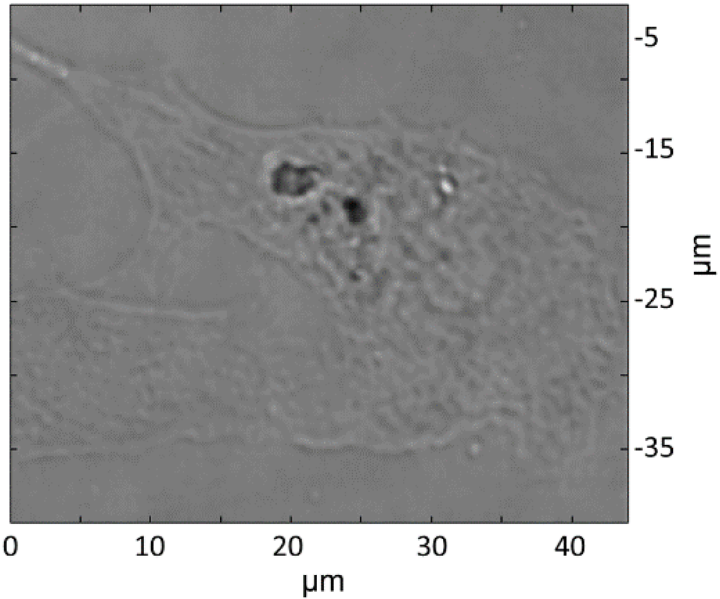 Figure 5 shows the Raman mapped lung epithelial cell. Large particle agglomerates can be observed directly in the optical microscope image, but this image alone is not enough to prove that particles are inside the cell. As a comparison, Figure 6 shows an optical microscope image of a control cell, which was not exposed to particles. Typically, black dots, which do not represent PS particles, are visible inside cells in optical microscope images of unexposed cells. Thus inspections of optical microscopy images alone cannot be used to distinguish PS particles in cells.