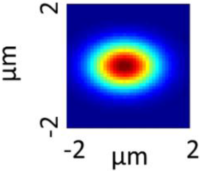 The first derivative of intensity profiles, i.e., line mappings, over the border of a sharp edge between known materials can be used as an approximation of the PSF [17]. Here we measured across the edge of an Au structure in a 1951 USAF patterned Au/Si reference sample to determine the PSF. The PSF (Figure 7) was approximated from the measurements of the 1951 USAF patterned Au/Si reference sample by fitting Gaussian functions to the derivatives of the Si Raman band at 520.7 cm−1 intensity profiles. The experimentally determined PSF map was found to be slightly elliptic, similar to previous reports using same types of Raman microscopes [17]. The full width at half maximum (FWHM) of the PSF was 1.22 µm (Y-direction) and 1.70 µm (X-direction). This is much larger than the theoretical spatial resolution according to the Rayleigh criterion (350 nm). It should be remarked that the contrast in the Raman image of the 1951 USAF patterned Au/Si reference sample is much higher than the contrast in the Raman images of particles in cells. The approximated PSF can therefore be expected to be much narrower than the true PSF in the Raman images of cells. The approximated PSF from the Au/Si reference was used as a reasonable approximation since there are no sharp edges in the Raman images of cells from where a reliable PSF can be approximated.