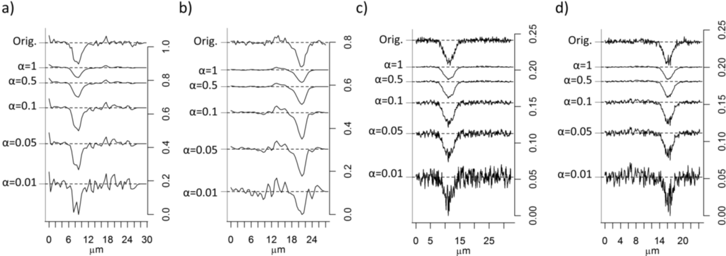 Intensity line scans of score-values from thePC2 score maps in Figure 3c,d after application of the super-resolution algorithm with different α-values at different location in the images where particles are located: (a) X = 8.5 µm in PC2 for the 500 nm image; (b) Y = 21 µm in the 500 nm image; (c) X = 11.5 µm, in the 100 nm image; and (d) Y = 16.1 µm in the 100 nm image. The curves are shifted along the ordinate axis for clarity.