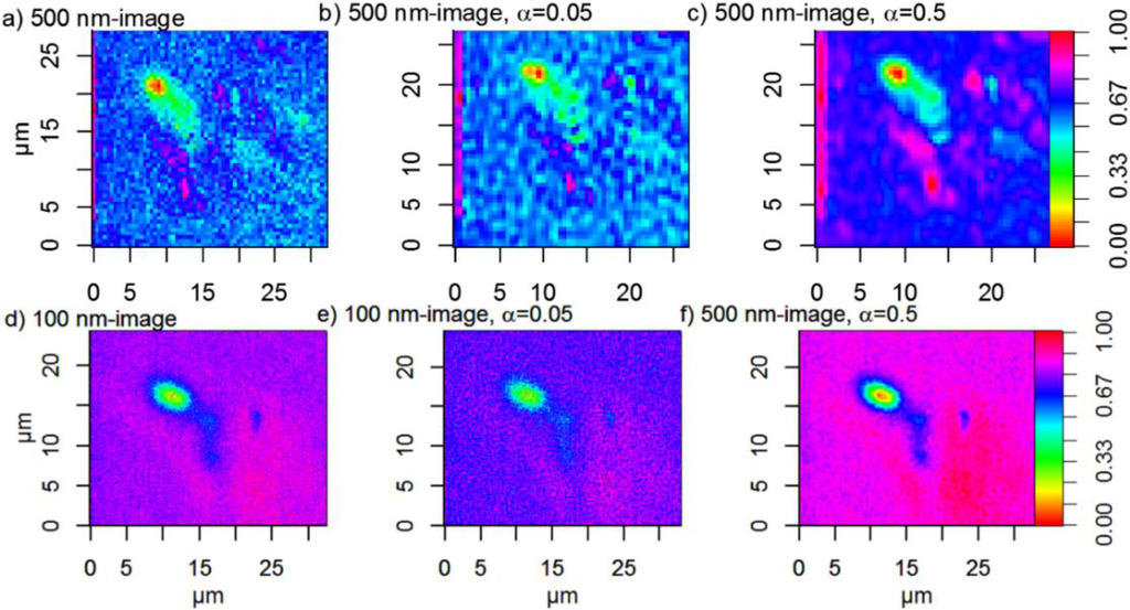 Normalized images of PC2, i.e., score values ranging from 0 to 1. (a) 500 nm image; (b) 500 nm image treated with super-resolution algorithm, α = 0.05; (c) 500 nm image treated with super-resolution, α = 0.5; (d) 100 nm image; (e) 100 nm image treated with super-resolution algorithm α = 0.05; (f) 100 nm image treated with super-resolution algorithm, α = 0.5. Note that the (0,0) point is not the same in the 500 nm images and the 100 nm images.