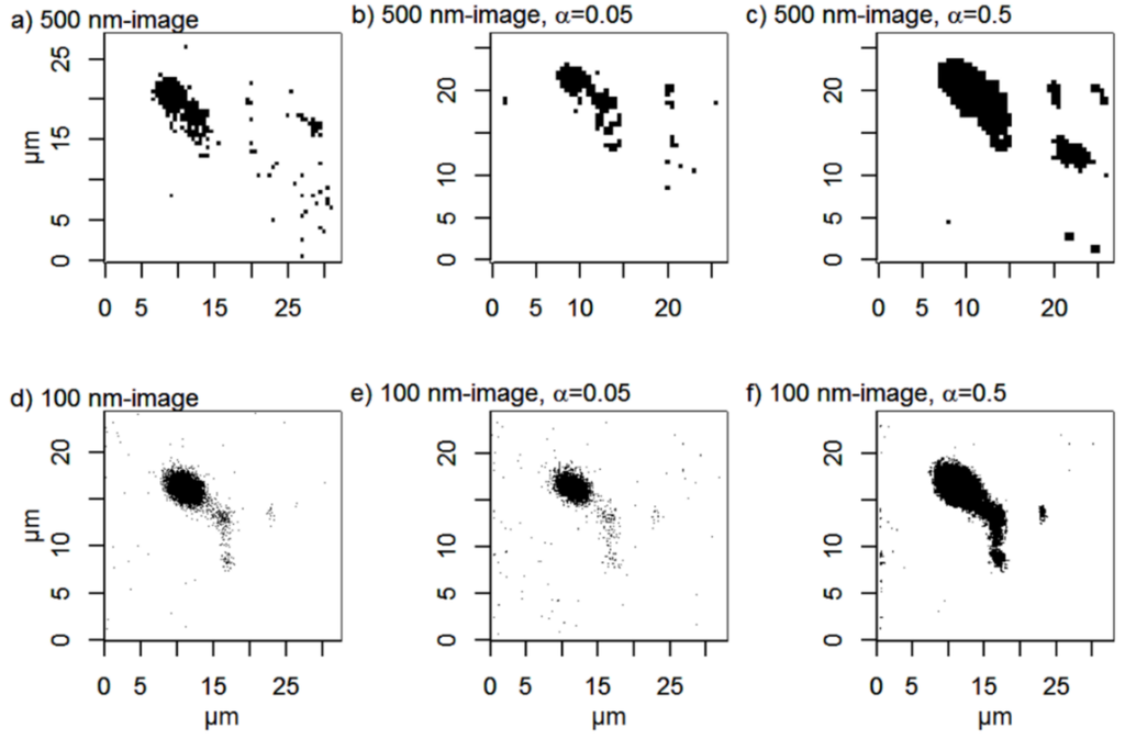 In conclusion, our results show that application of super-resolution algorithms does not significantly improve the spatial resolution beyond the theoretical microscopy limit in our biological samples (Figure 8, Figure 9, Figure 10 and Figure 11). Instead we find that the major advantage of applying super-resolution in these particular applications is noise removal with maintained spatial resolution, which facilitates reliable detection of particles in complex biological matrices, as visualized by intensity lines over closely positioned particles and by threshold images, where small particles, smaller than can be distinguished from noise in the original images, can be observed. The smoothing effect of the Tikhonov regularization is adjusted by the regularization parameter α: high α-values give smoother images, but may on the other hand give less sharp edges. In this case, the original images are noisy and it is therefore advantageous to use a high α-value in order to detect more particles in the images. Images calculated with super-resolution algorithms using high α-values yield improved contrasts and reduced noise, which facilitates the separation of closely positioned particle agglomerates. The effect is most pronounced in the 100 nm step-size images compared to the 500-nm step-size images acquired with the same measurement time per pixel, which is not surprising since it contains many more pixels than the 500 nm image. The original 500 nm image contains more noise than the 100 nm image and some of the artefacts are enhanced after application of the super-resolution algorithm. To detect as many particles as possible and at the same time avoid noise, it is therefore suggested to collect images with a short step length and thereafter apply super-resolution algorithms to further improve the image quality.