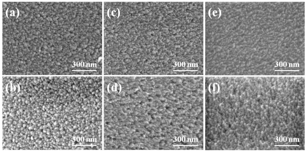 Surface morphologies of the Ga2O3-doped ZnO (GZO) thin films as a function of substrate and deposition temperature. (a) Glass; (b) polyimide (PI); (c) 373 K-Glass; (d) 373 K-PI; (e) 473 K-Glass; and (f) 473 K-PI, respectively.