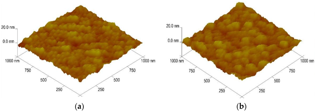 Atomic force microscopy (AFM) analysis of the GZO thin films as a function of substrate at room temperature. (a) Glass and (b) PI, respectively.