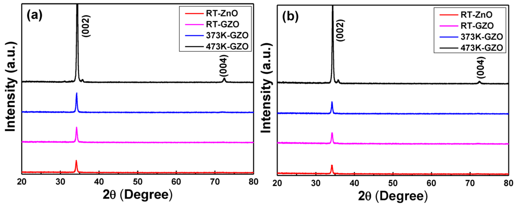 Figure 7 shows a typical widescan spectrum of the GZO thin films as a function of the used substrates. The photoelectron peaks of the main elements, Zn, O, and Ga, and Auger Zn and Ga LMM (electron excited from L layer to M layer) and O KLL (electron excited from K layer to L layer) peaks were obtained. As Figure 7 shows, some small peaks with intensities lower than each main photoelectron peak were also observed.