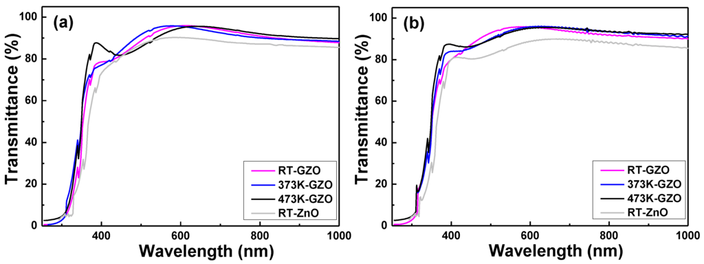 Figure 4 shows the transmission spectra of the GZO thin films plotted against the different deposition temperature and on different substrates; the measured wavelength was in the region of 300–1000 nm. The transmission spectrum of the RT-deposited ZnO thin films is also added in Figure 4 as a reference for the GZO thin films. For the GZO thin films, the absorption edges were blue-shifted and the transmittance ratios were higher as compared with that of the RT-deposited ZnO thin films. As Figure 4 shows, the maximum transmittance ratios of all the GZO thin films in the range of visible light (400–700 nm) were more than 95%, regardless of deposition temperature and substrate. We know that many factors will affect the transmission spectrum of the GZO thin films. The increase of the transmission ratio in the optical band is caused by the increase in carrier density, because a higher deposition temperature can cause the GZO thin films to have fewer defects. The higher deposition temperature could even cause the GZO thin films to have better crystallization; the average and maximum transmittance ratios of all the GZO thin films in the region of visible light had no apparent variation as the deposition temperature increased. The reason is that the optical band gap (Eg) of the GZO thin films is in the region of ultraviolet light, thus the optical energy in the region of visible light cannot excite the electrons, and then the GZO thin films in the range of visible light will have high transmittance ratios. As Figure 4 shows, the average transmittance ratios of all the GZO thin films in the range of visible light were about 90.9%–92.8% and in the range of near-infrared light (700–1500 nm) they were about 84.8%–88.9%, respectively. The detailed optical properties of the GZO thin films deposited on different substrates and at different temperatures and ZnO thin films deposited on different substrates are compared in Table 2.