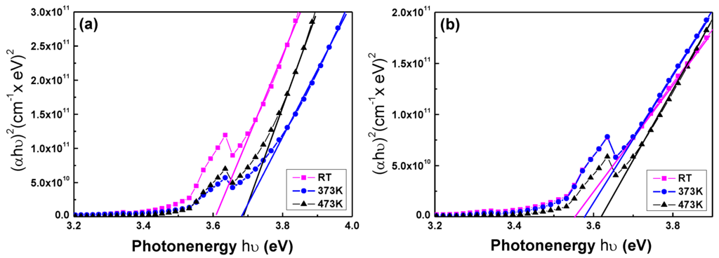 In the transmission spectra of all the GZO thin films, a greater sharpness was noticeable in the curves of the absorption edges, and the optical band edges had no apparent shift as the deposition temperature increased. In the past, determination of the optical band gap (Eg) was often necessary to develop the electronic band structure of a thin-film material. However, using extrapolation methods, the Eg values of the GZO thin films can be determined from the absorption edge for direct interband transition, which can be calculated using the relation in Equation (3) as follows: