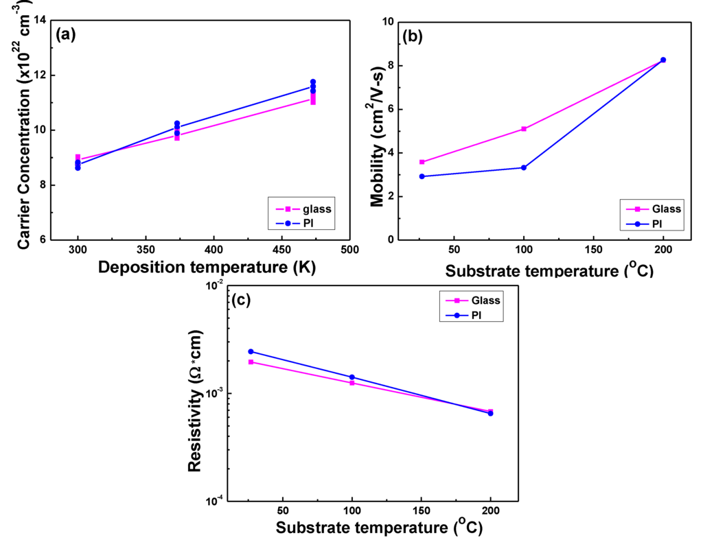 The variations of the carrier concentration, carrier mobility, and resistivity of the GZO thin films at different deposition temperatures on glass and PI substrates are compared Figure 6. Figure 6a shows that the carrier concentration of the GZO thin films increased with the raising deposition temperature. When the GZO thin films are deposited on glass or PI substrates by using the RF sputtering process, many defects and pores will exist and inhibit the electrons’ movement. Using a higher deposition temperature during the deposition process can lead to an enhancement of the thin films’ densification and crystallization; the increase in the diffraction intensity of the (002) peak, as shown in Figure 3, has proven those results. That can decrease the numbers of defects and pores in the GZO thin films and can decrease the inhibition of the barrier electron transportation [24]. Also, as the deposition temperature was raised from RT to 473 K, the carrier (electron) concentration increased from 8.92 × 1020 to 11.1 × 1020 cm−3 for glass substrates and from 8.74 × 1020 to 11.6 × 1020 cm−3 for PI substrates. Figure 6b shows that the carrier mobility of the GZO thin films increased with the raising deposition temperature and was almost independent of the used substrates. Figure 6b also shows that as the same deposition temperature was used, the carrier mobility of the GZO thin films on glass substrates was higher than that of the GZO thin films on PI substrates. As the deposition temperature was raised from RT to 473 K, as Figure 6b shows, the carrier mobility increased from 3.58 to 8.25 cm2/V-s for glass substrates and increased from 2.92 to 8.28 cm2/V-s for PI substrates. The improvement in electron mobility could be attributed to the re-crystallization of the GZO thin films that takes place during the deposition process with the increase of the deposition temperature.