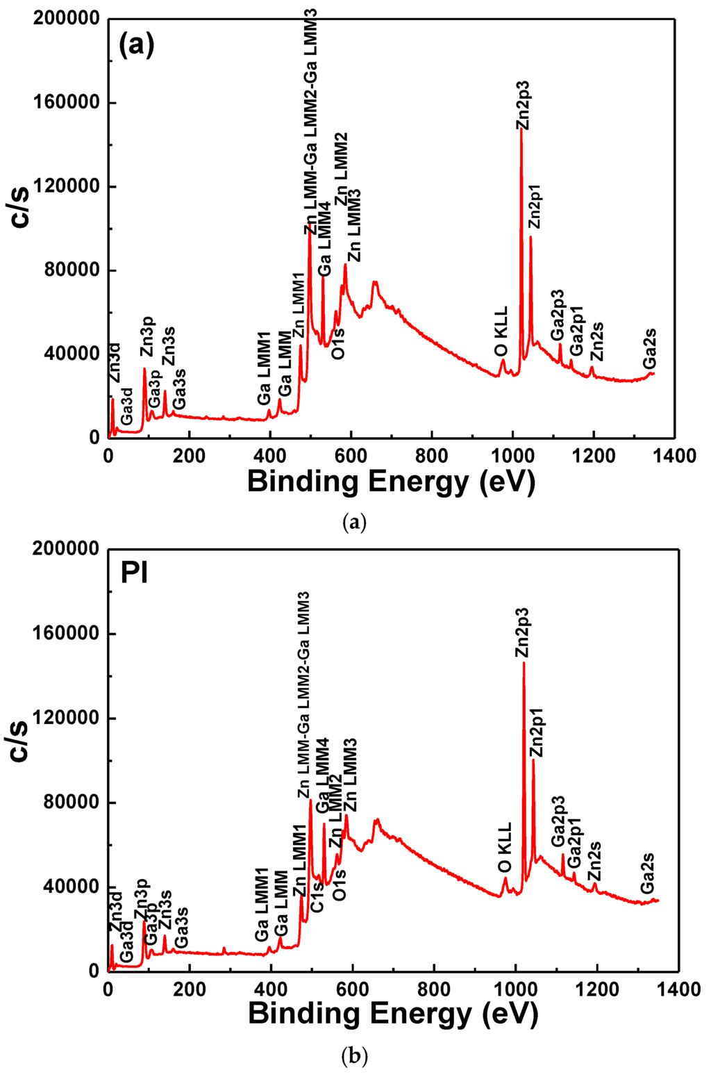 Typical widescan spectrum of the GZO thin films as a function of used substrates. (a): glass; (b): PI.