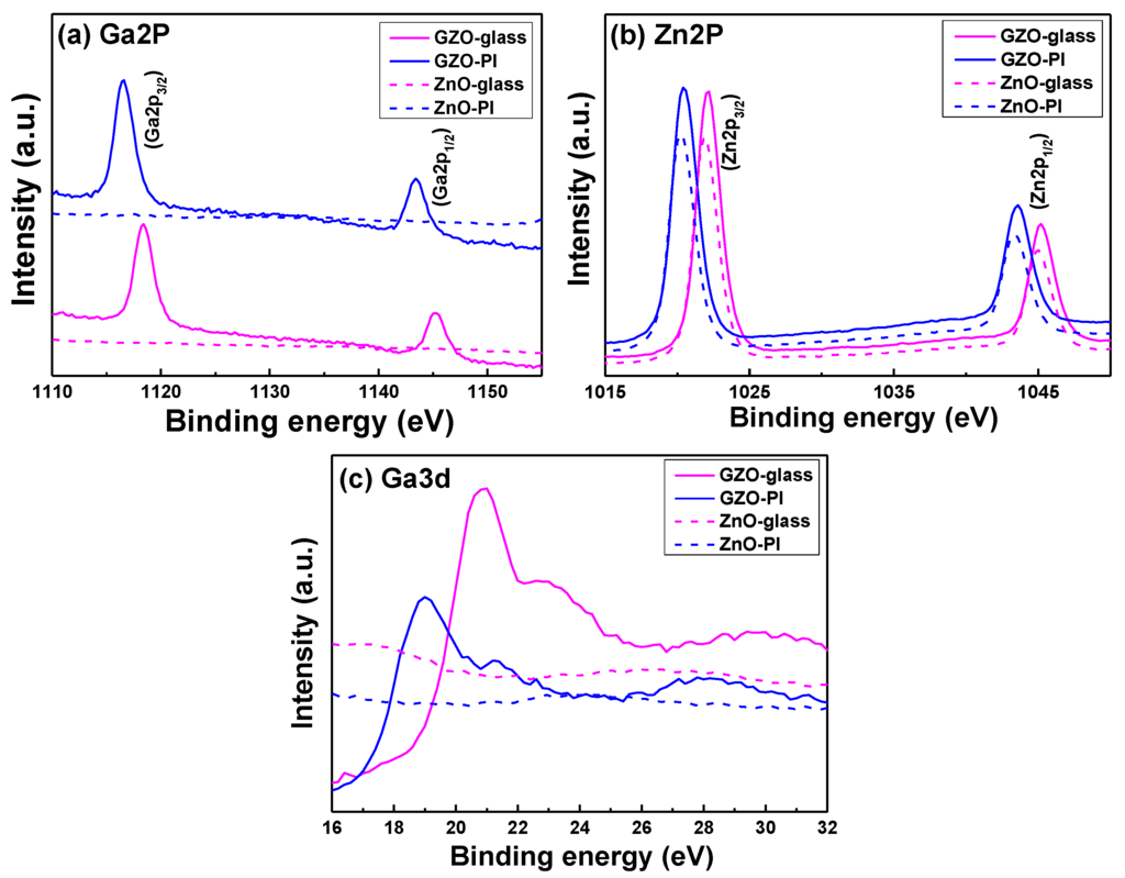 To clarify the mechanism of improvement in electrical properties, the chemical structures of the GZO thin films were investigated by XPS. The XPS spectra for the Ga2p1/2, Ga2p3/2, Zn2p1/2, Zn2p3/2, and Ga3d peaks of the GZO thin films are shown in Figure 8 as a function of the used substrates, and the values are compared in Table 3; those thin films were deposited at RT. The XPS spectra for the Ga2p1/2, Ga2p3/2, Zn2p1/2, Zn2p3/2, and Ga3d peaks of the ZnO thin films are also shown in Figure 8 for comparison. When glass was used as the substrate, the binding energy of each constituent element was positioned at 1145.22 eV (Ga2p1/2), 1118.36 eV (Ga2p3/2), 1045.23 eV (Zn2p1/2), 1022.10 eV (Zn2p3/2), and 20.72 eV (Ga3d), respectively, as calibrated to 285.43 eV (C1s); When PI was used as the substrate, the binding energy of each constituent element was positioned at 1143.35 eV (Ga2p1/2), 1116.52 eV (Ga2p3/2), 1043.64 eV (Zn2p1/2), 1020.47 eV (Zn2p3/2), and 19.06 eV (Ga3d), respectively. We know the binding energies of Ga2O3 and Ga metal are 1117.4 ± 0.5 eV and 1116.5 ± 0.2 eV. As Figure 8a shows, no apparent peak could be observed in the XPS spectra of the Ga3d peak of the ZnO thin films. For that, the results in Figure 8a suggest that the binding state of Ga2O3 will dominate the GZO thin films on glass and the binding state of Ga will dominate the GZO thin films on PI.