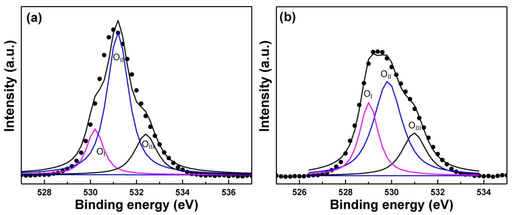 Figure 9a shows the XPS spectra for the Gaussian-resolved components of O1s of the GZO thin films on glass substrates; those thin films were deposited at RT. The bonding energy components were centered at 531.17 eV and 529.35 eV for glass and PI substrates, respectively. As shown in Figure 9a, two shoulders were visible on the low-energy side and high-energy side of the GZO thin films, indicating that at least three different bonds existed. For GZO thin films deposited on glass substrates, the bonding state of the O1s spectrum was resolved into three components centered at 530.21 eV, 531.18 eV, and 532.39 eV for the OI, OII, and OIII peaks, respectively. As shown in Figure 9b, only one shoulder was visible on the high-energy side of the GZO thin films, and we also found that three different bonds existed. For GZO thin films deposited on PI substrates, the bonding state of the O1s spectrum was resolved into three components centered at 529.03 eV, 529.83 eV, and 531.02 eV for the OI, OII, and OIII peaks, respectively. Table 4 shows the area ratios of the OI, OII, and OIII peaks; the area beneath the peaks is clearly different for these two substrates.